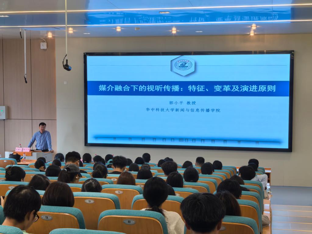 11月14日下午,应我院邀请,华中科技大学新闻与信息传播学院教授、博士生导师、副院长郭小平在博文楼A302作题为《数智时代的视听传播:特征、变革及演进原则》的学术报告。报告会由院长邓建教授主持,师生近200人现场聆听了报告。